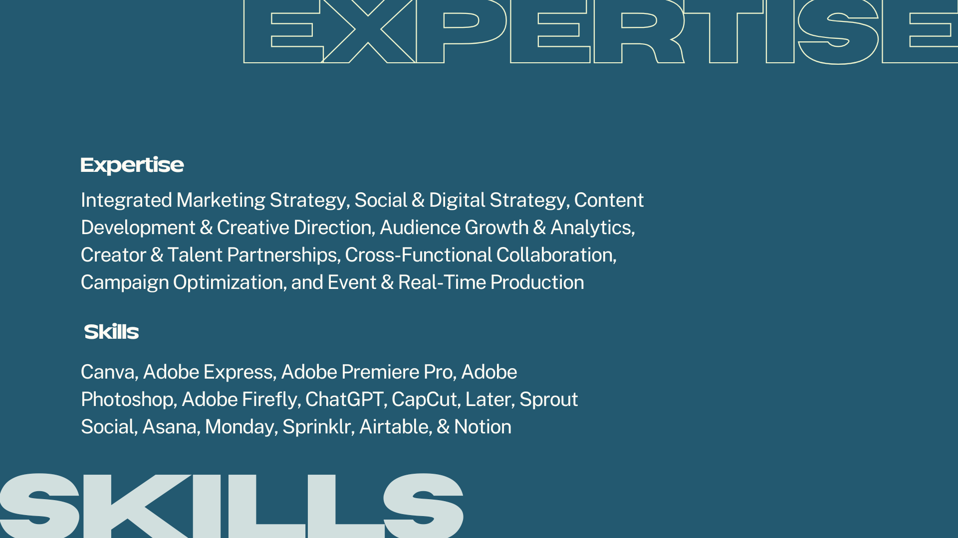 I specialize in ideating and producing digital campaigns that are unique to brands' short-term and long-term goals per project, such as building stronger communities and engaging content.